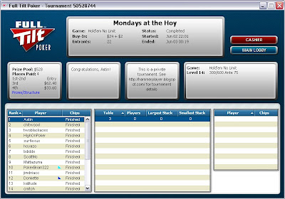 Hoy has mixed up the regular Monday game yet again. I am not a fan. I loved the move to 6-max, but not this buy-in to a Sunday game satellite payout structure. Obviously, with the ability to unregister and receive T$, it's not TERRIBLE, but it all seems unnecessary.